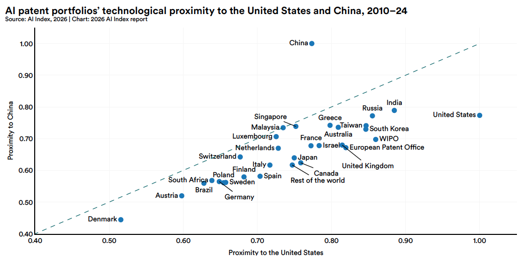Os EUA ainda produzem mais modelos de ponta e patentes de alto impacto; a China lidera em volume de publicações, citações, volume de patentes e instalações de robôs industriais. A Coreia do Sul lidera o mundo em patentes de IA per capita.