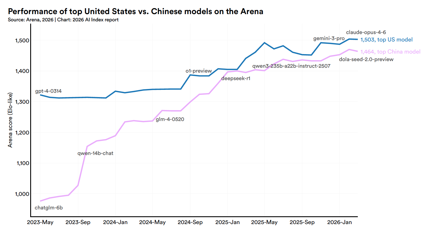 • A margem de 2,7% entre o melhor modelo americano e o melhor modelo chinês — está se fechando, estabilizando ou abrindo?