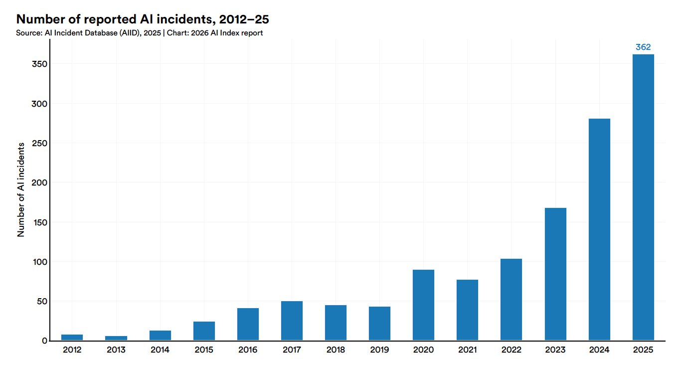 Quase todos os laboratórios reportam resultados em benchmarks de capacidade de forma competitiva e detalhada. O reporte de benchmarks de IA responsável é descrito pelo próprio relatório como irregular e seletivo. Em 2025, os incidentes documentados com IA chegaram a 362, contra 233 em 2024, aumento de 55% em um ano. Uma pesquisa citada no relatório revelou que melhorar uma dimensão de IA responsável, como segurança, pode degradar outra, como acurácia, trade-off que raramente aparece nas comunicações públicas dos laboratórios.