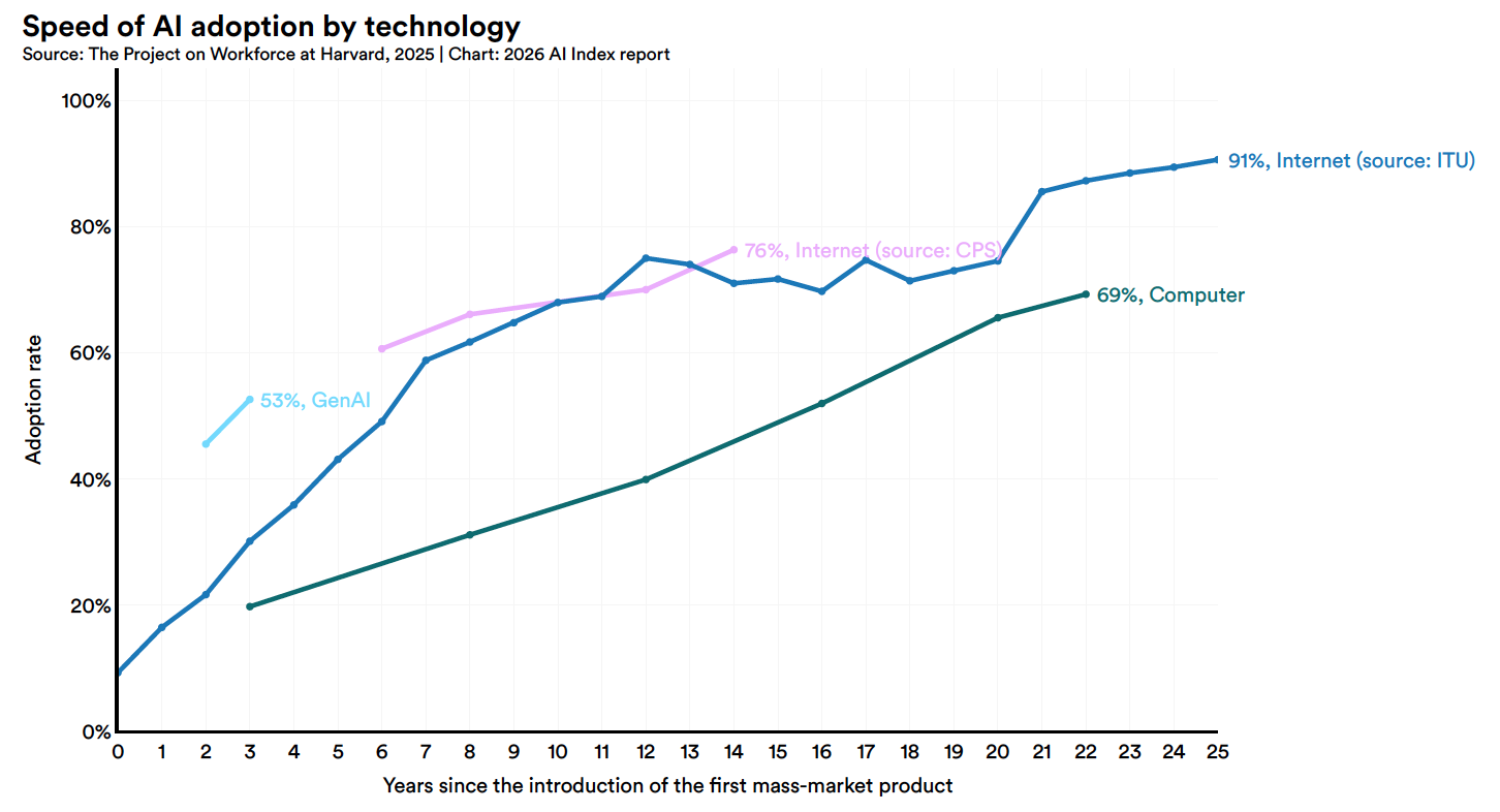 A Inteligência Artificial já ultrapassou o ponto de experimentação. Em 2025, 88% das organizações reportaram algum nível de uso, enquanto a adoção de IA generativa atingiu 53% da população global em apenas três anos — velocidade sem precedente histórico comparável. O PC e a internet levaram décadas para alcançar difusão similar.