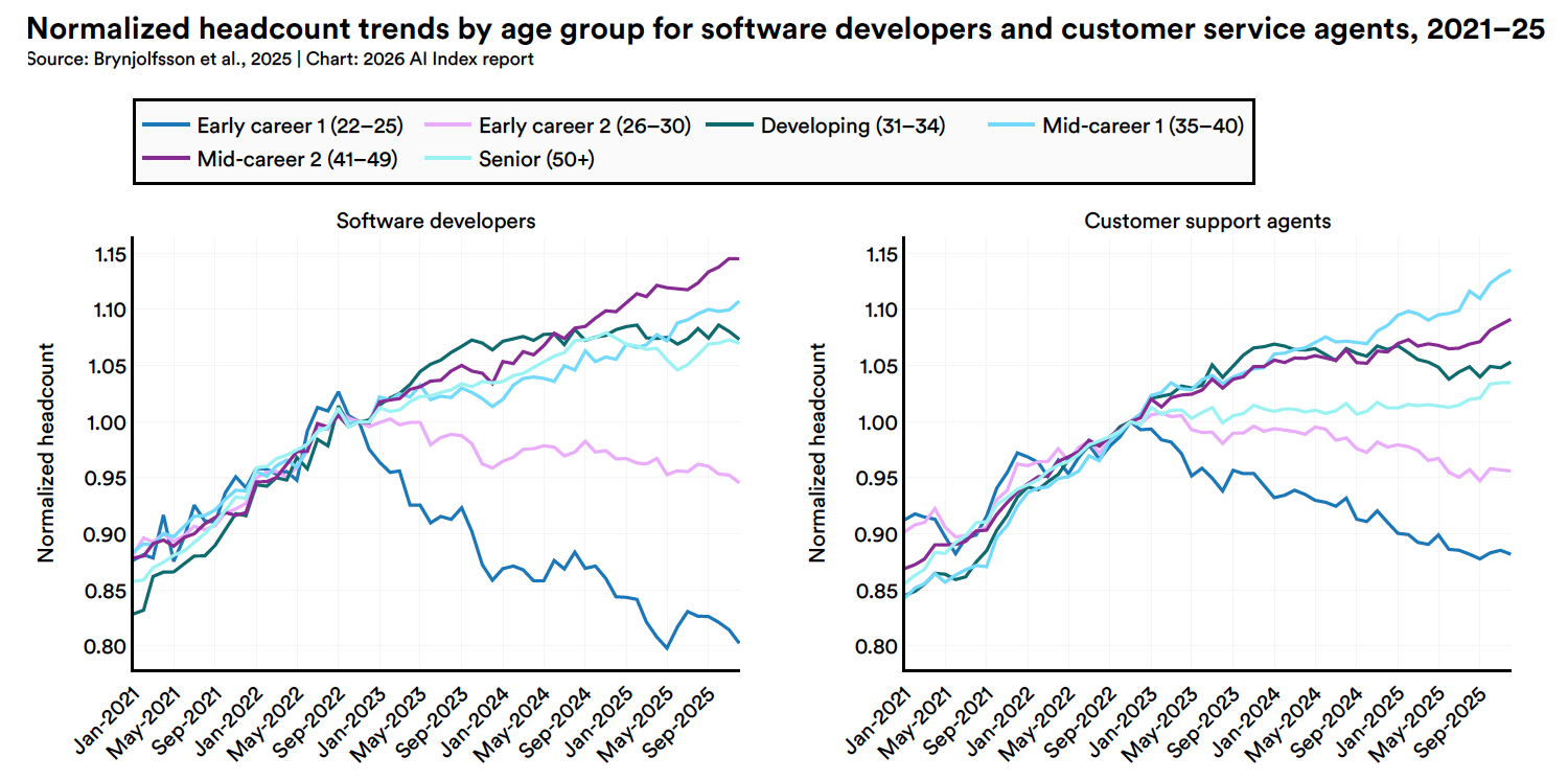 A análise de impacto no emprego cobre desenvolvedores americanos jovens, sem dados sobre outros setores, sobre trabalhadores de meia-carreira ou sobre outros países.