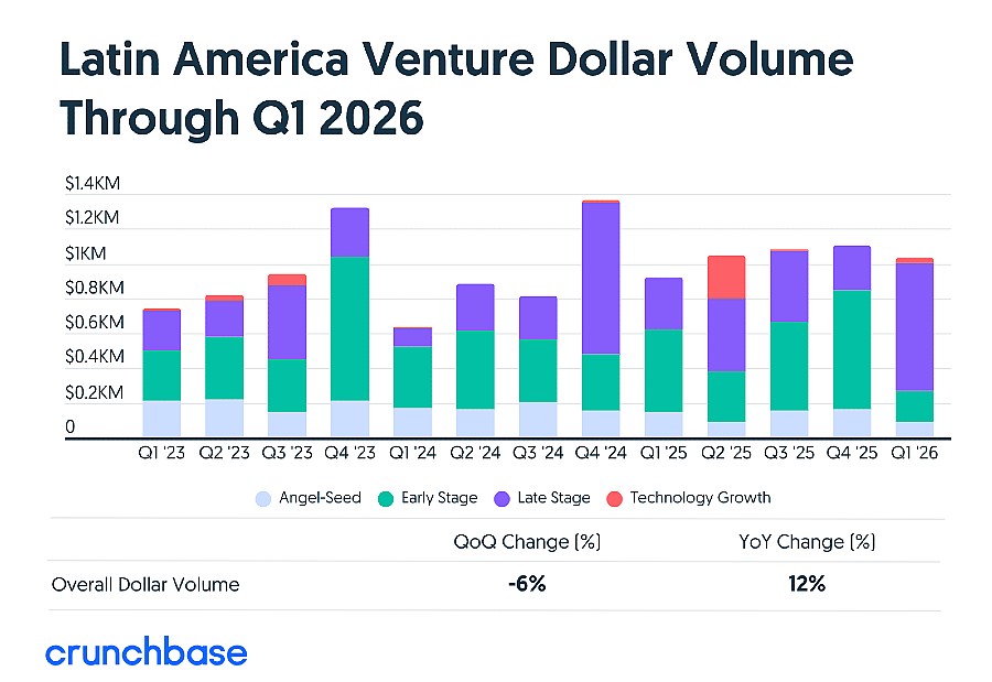 As startups latino-americanas captaram US$ 1,03 bilhão em rodadas seed e de crescimento no primeiro trimestre de 2026, uma alta de 12% em relação ao mesmo período de 2025. Mas o número que realmente importa para quem toma decisões de alocação de capital está em outro lugar: dos US$ 1,03 bilhão totais, US$ 761 milhões foram para deals de late-stage e growth. Esse valor representa uma expansão de 158% frente aos US$ 295 milhões registrados no primeiro trimestre de 2025, e de 203% em comparação com os US$ 251 milhões do quarto trimestre de 2025.