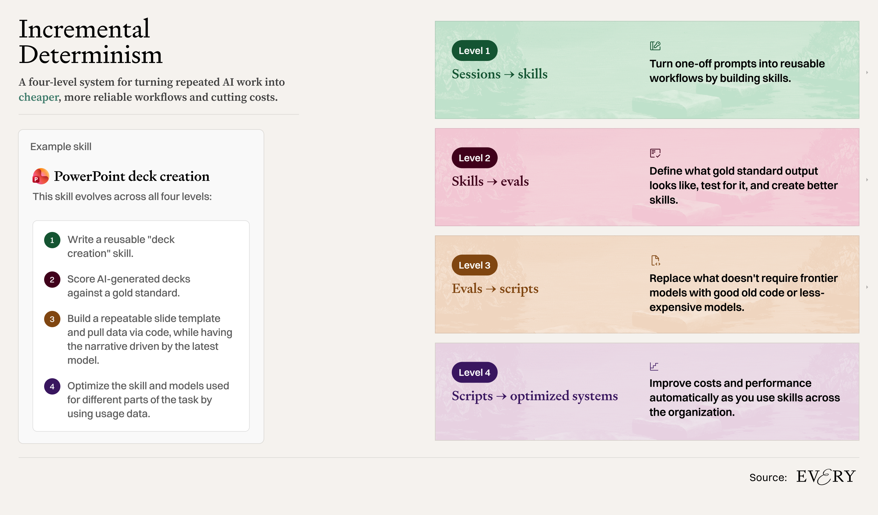 No terceiro, etapas que não exigem julgamento são convertidas em código determinístico, mais rápido, mais barato, sem LLM.