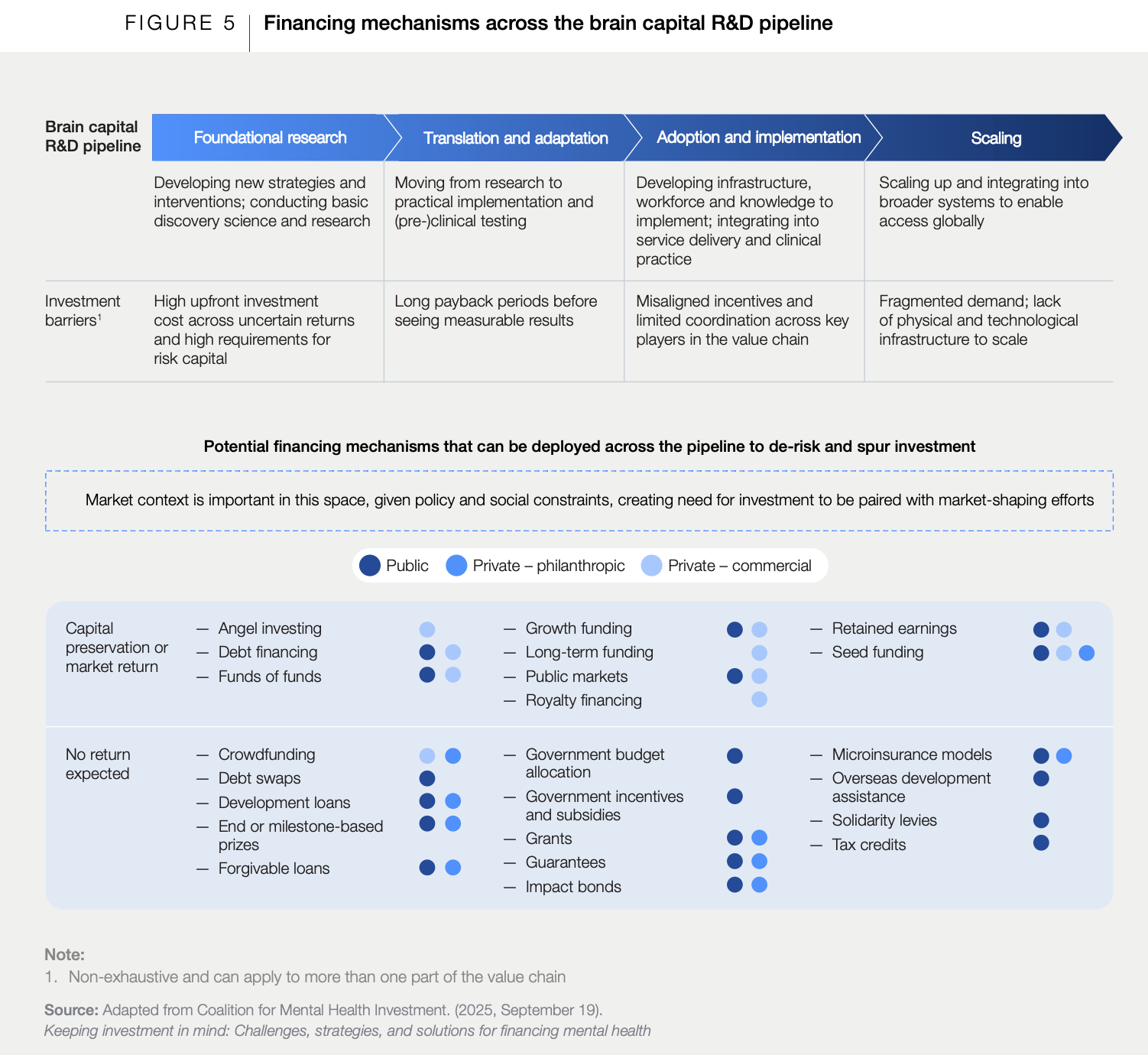 Um dos pontos mais críticos do material do McKinsey Health Institute é o diagnóstico de desalinhamento entre a escala do desafio do capital cerebral e o padrão atual de investimentos. Hoje, a maior parte do financiamento em pesquisa e desenvolvimento relacionado ao cérebro concentra-se no tratamento de estágios avançados de doença. Prevenção, detecção precoce e ciência aplicada ao desenvolvimento de habilidades cognitivas positivas recebem atenção proporcionalmente menor.