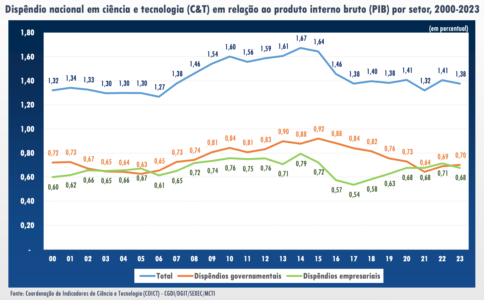 Os dados mais recentes são do ano passado, referentes ao ano de 2023, quando o investimento nacional total em Ciência e Tecnologia atingiu R$ 150,9 bilhões e o em P&D, R$ 130,6 bilhões em valores correntes.