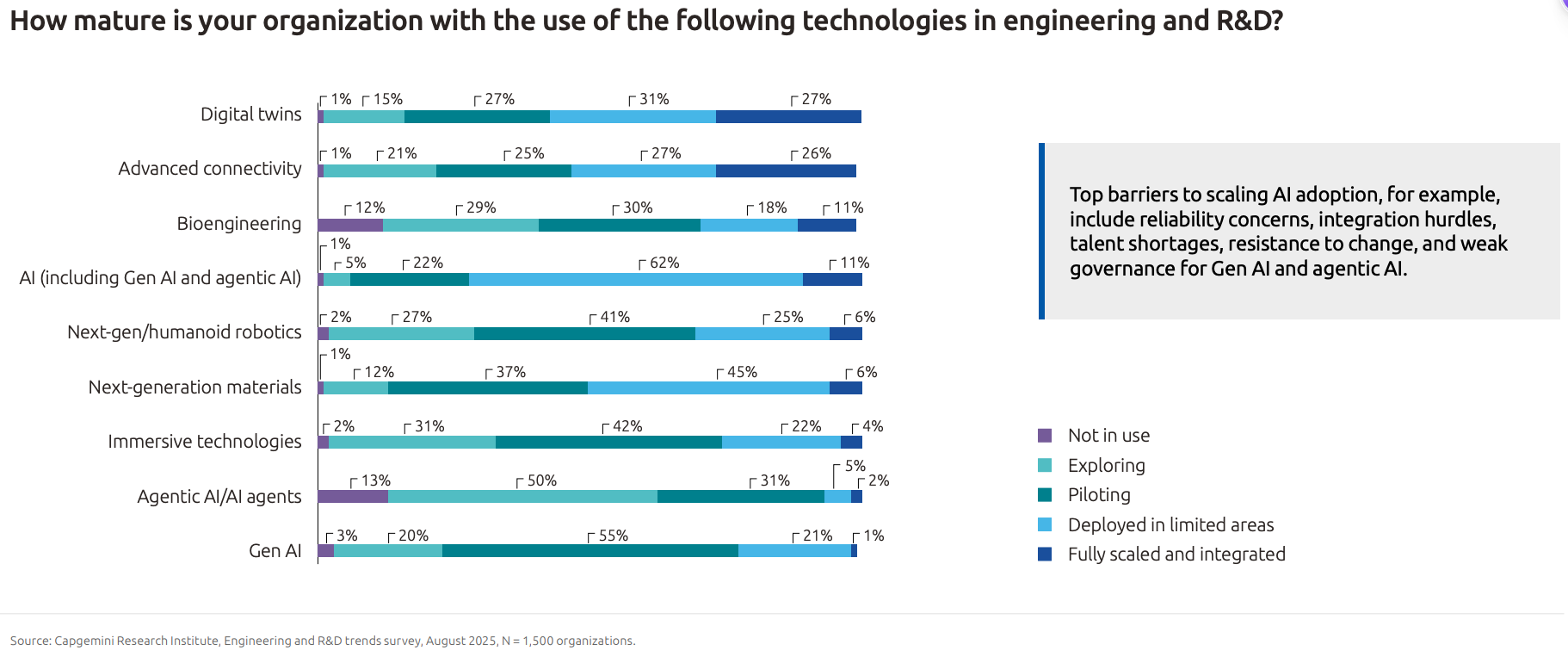 Mas o entusiasmo encontra rapidamente seus limites na realidade operacional. Apesar do alto potencial atribuído, a maturidade dessas tecnologias ainda é baixa. Em IA — incluindo GenAI e agentes — a maioria das organizações permanece presa a pilotos ou implantações restritas. O mesmo ocorre com gêmeos digitais e materiais avançados.