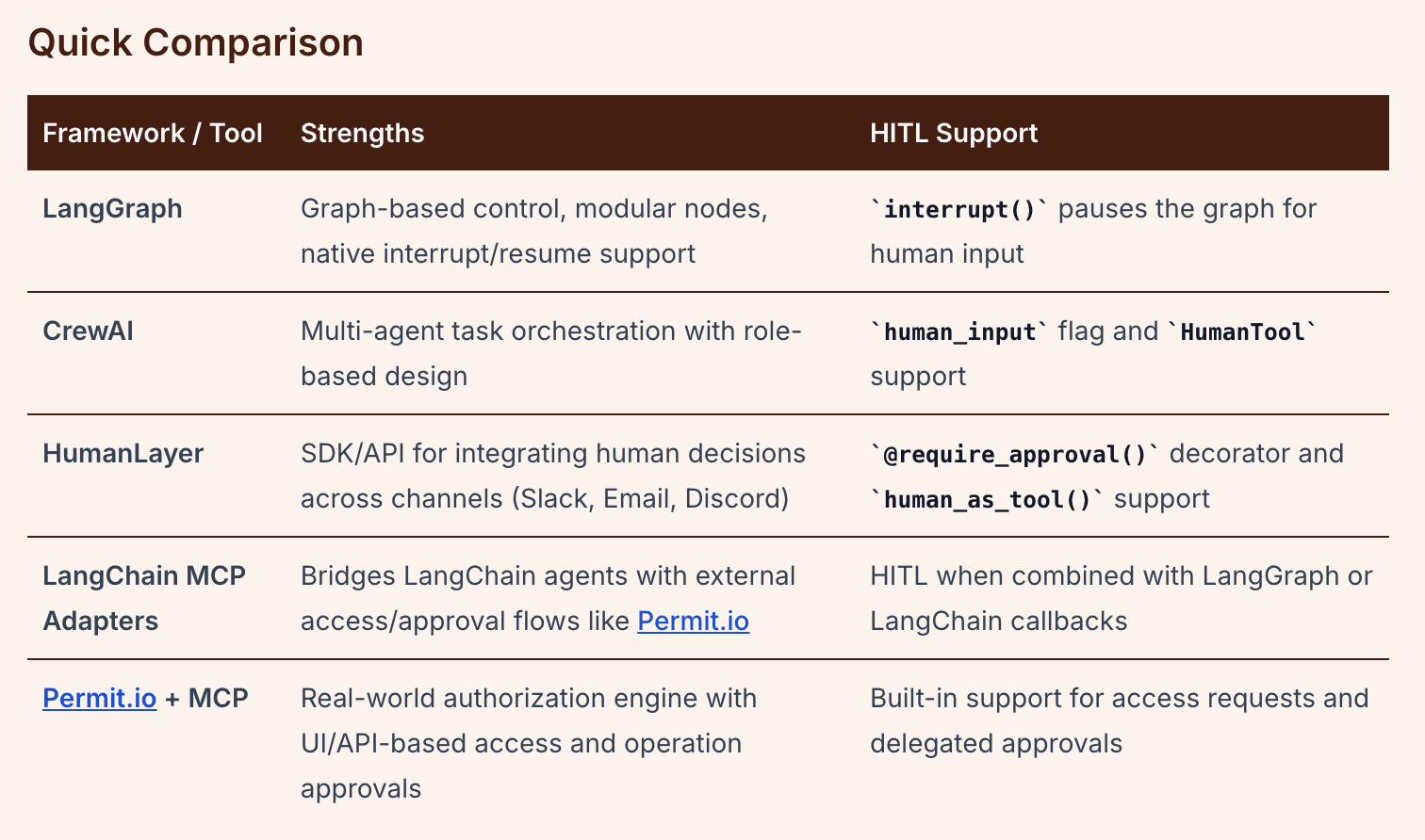 A seguir, apresentamos uma análise das estruturas e bibliotecas mais eficazes que você pode usar atualmente para criar fluxos de trabalho com interação humana (HITL) para agentes de IA. Cada uma tem um foco diferente, mas todas oferecem algum tipo de delegação de permissão ou aprovação humana em tempo real.