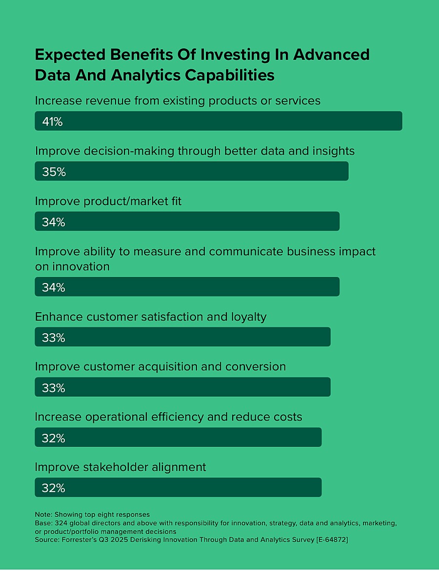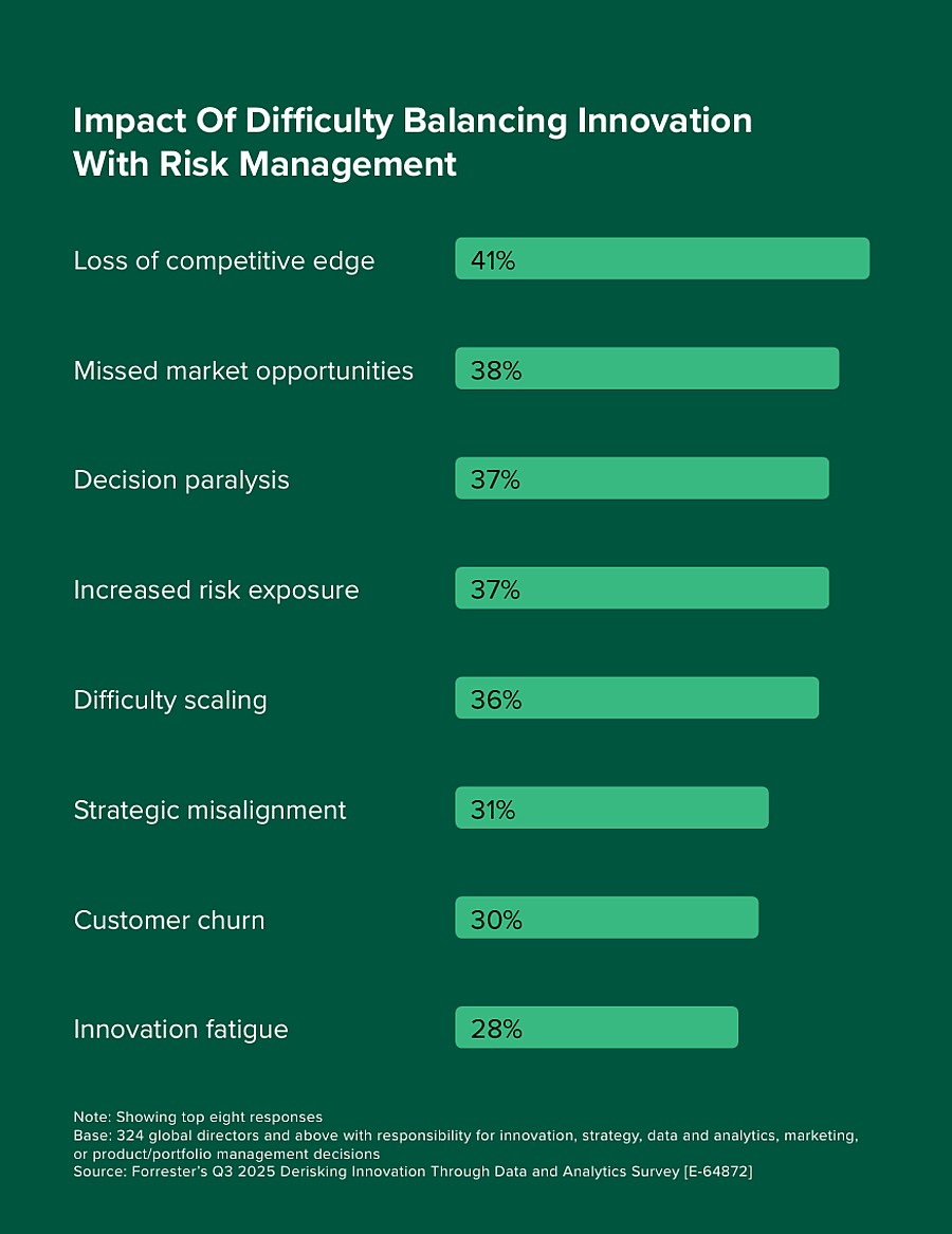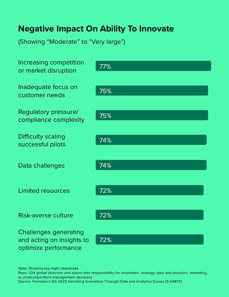 O estudo mostra que 73% das empresas têm dificuldade em integrar dados entre sistemas e equipes, enquanto 69% não conseguem alinhar analytics à estratégia de negócios. Sem métricas claras, 59% lutam para medir o ROI da inovação, o que alimenta ceticismo interno, paralisia decisória (37%) e até fadiga de inovação (28%). Em vez de reduzir riscos, a ausência de experimentação estruturada faz com que 37% das organizações aumentem sua exposição a eles.