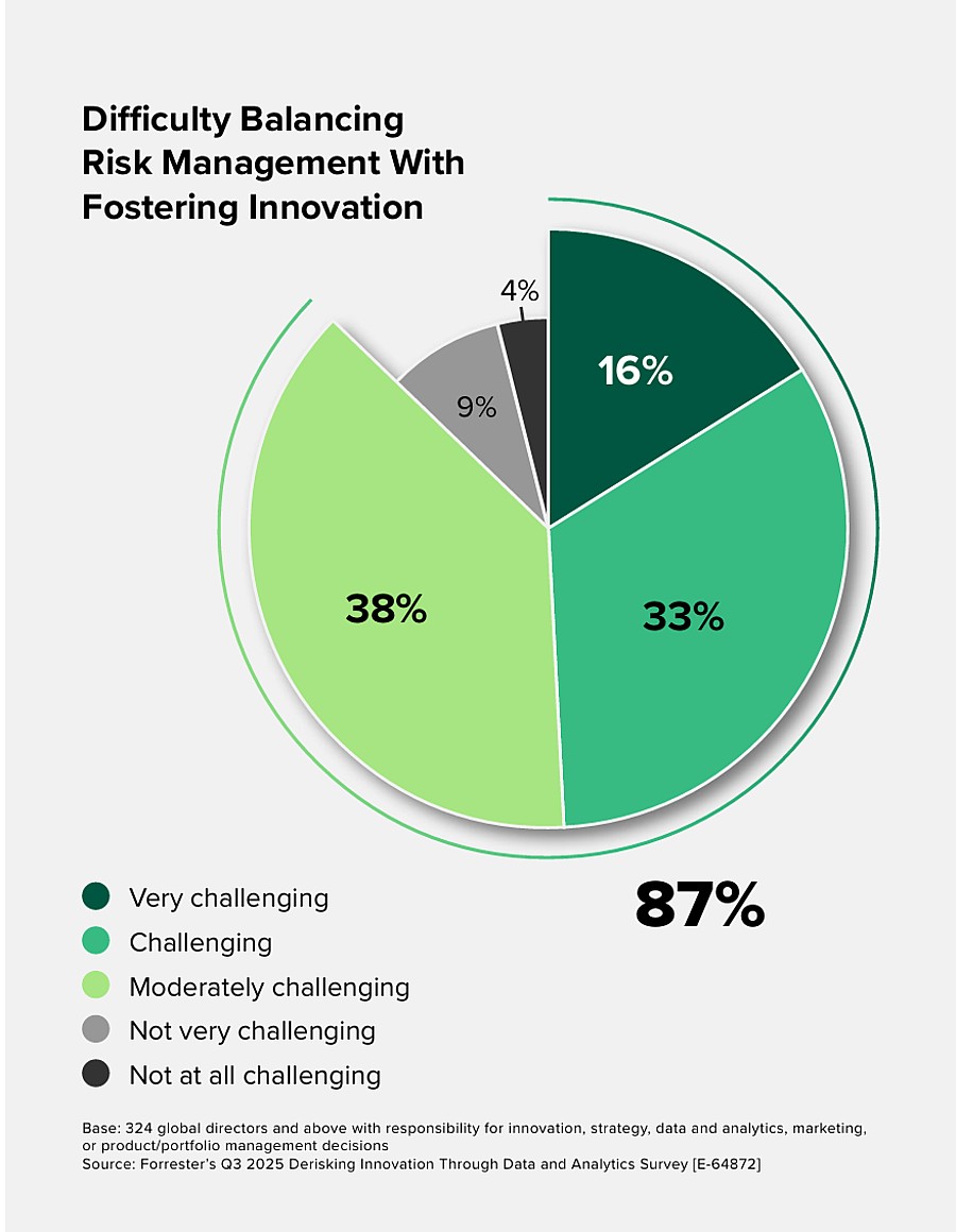 Se inovar é essencial, por que tantas empresas ainda avançam com tanta cautela? A resposta está no equilíbrio muitas vezes não claro entre inovação e gestão de riscos. O estudo mostra que 87% dos executivos consideram desafiador equilibrar inovação com riscos financeiros, regulatórios e reputacionais. O medo de errar – e errar grande – acaba se tornando um freio gigantesco para a tomada de decisão.
