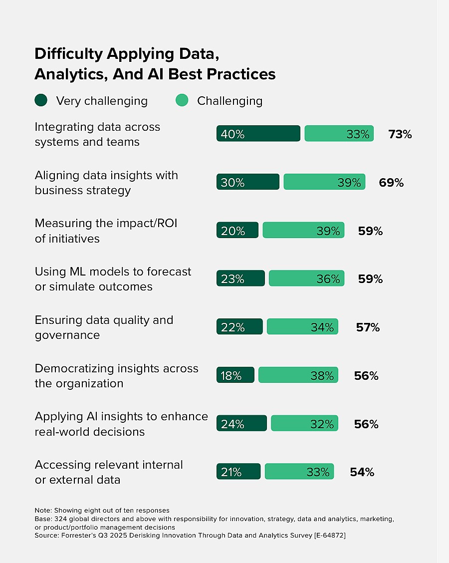 Um ponto que aparece com destaque no relatório e em outros estudos sobre inovação é que não existe inovação escalável sem boas práticas de dados e analytics. Sem essa base, decisões continuam sendo tomadas com intuição ou métricas parciais, o oposto do que a inovação baseada em dados exige. Ainda assim, é justamente nesse ponto que estão alguns dos maiores gargalos organizacionais. Os executivos apontam como principais desafios: