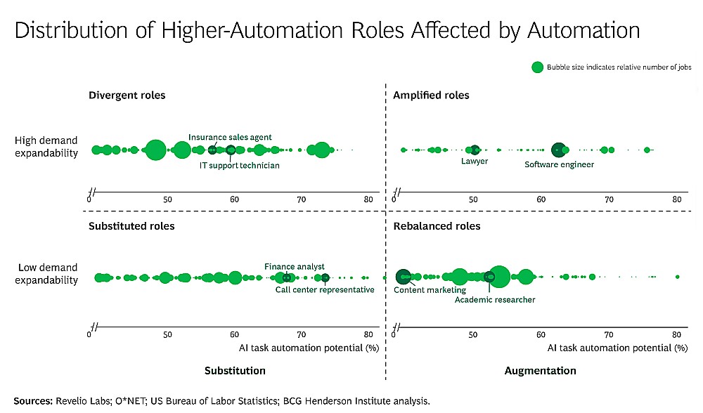 Na prática, a maior mudança ocorrerá dentro das funções existentes. Muitos profissionais continuarão ocupando o mesmo cargo, mas com responsabilidades diferentes. O estudo do BCG divide em seis categorias de impacto: