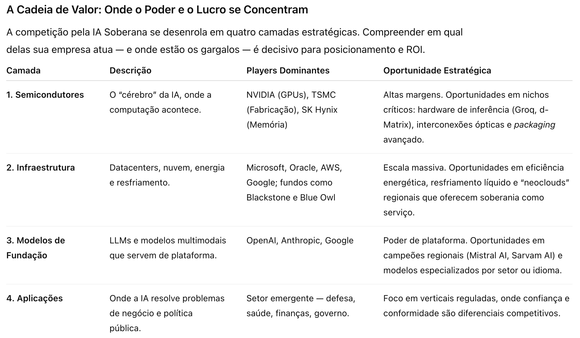 Quatro dimensões críticas — Cadeia de Valor, Fluxos de Capital, Modelos de Negócio e Cenários Futuros — oferecem um playbook acionável para o C-Suite. O mercado de IA Soberana representa uma oportunidade de US$ 1,5 trilhão, segundo a Oppenheimer (jun. 2025), impulsionada por um superciclo de investimento estatal e privado que pode chegar a US$ 8 trilhões até 2030, considerando a infraestrutura de energia necessária, de acordo com estimativas da Surocap e do PitchBook.