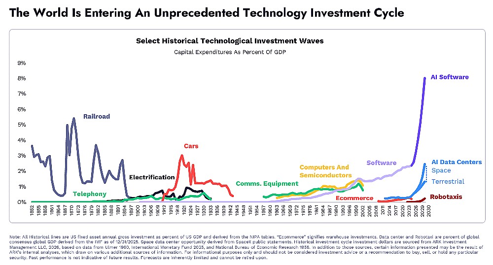 Essa é a tese da ARK Invest, contida na 10ª edição do relatório “Big Ideas 2026”, que se traduz em uma fase de “Grande Aceleração” (Great Acceleration), uma aceleração estrutural em produtividade, investimentos e criação de valor.