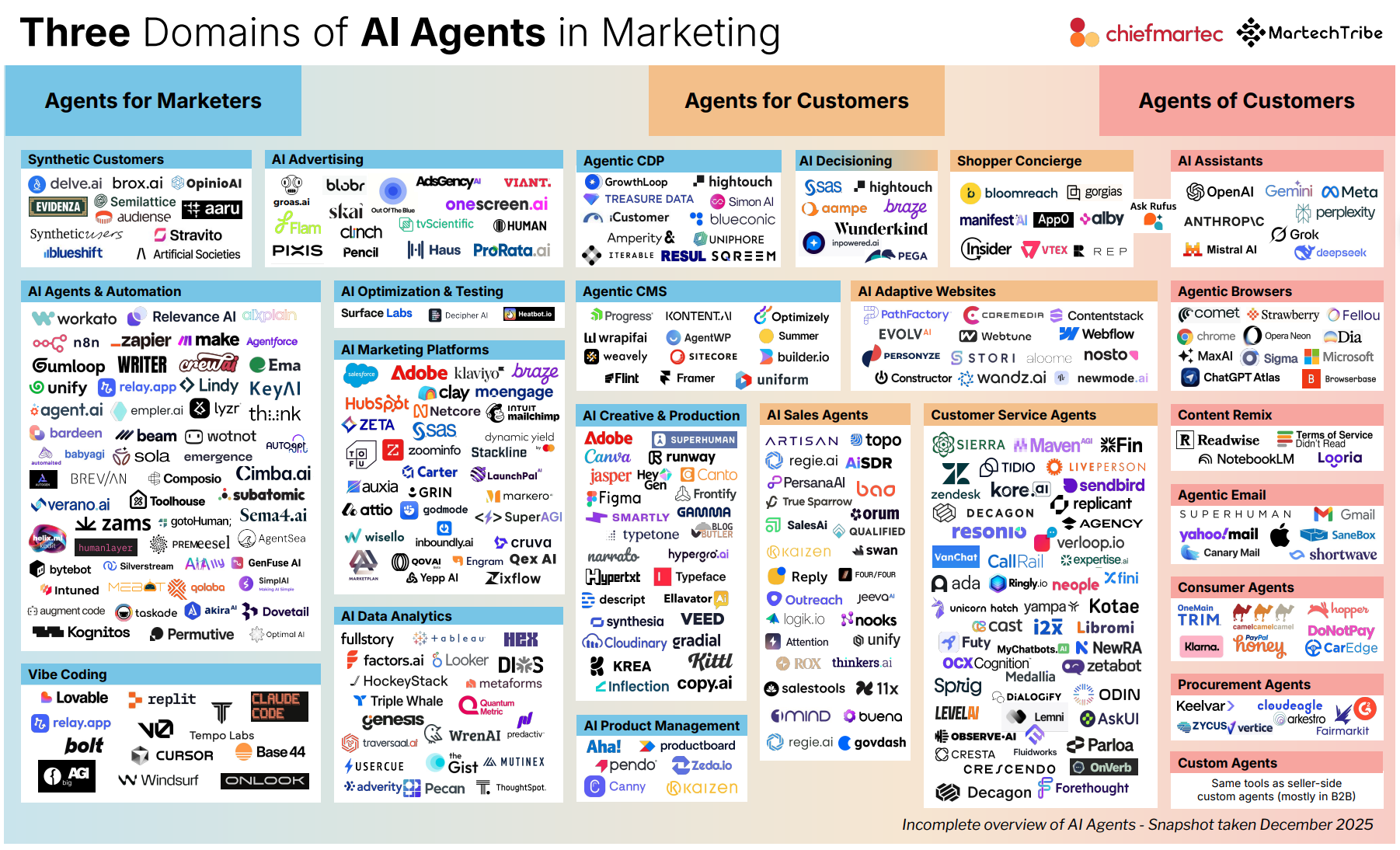 Os outros dois domínios – Agents for Marketers e Agents for Customers – crescem de forma incremental. Aumentam eficiência, reduzem custo operacional e expandem a capacidade de produção das equipes. A média atual é de 3,5 agentes internos por empresa, contra 1,71 agente voltado ao cliente e 1,46 agente operando do lado do consumidor. Os agentes internos respondem a comandos; os agentes voltados ao cliente respondem a objetivos – e essa diferença é estrutural.