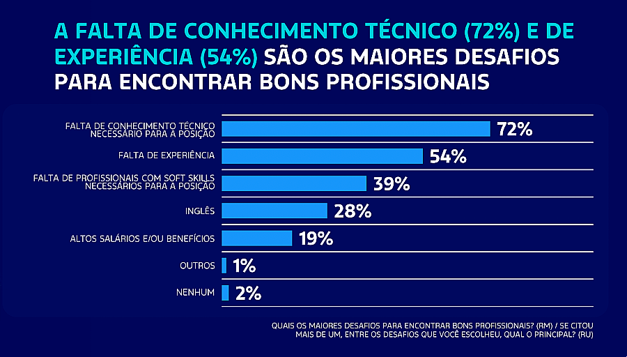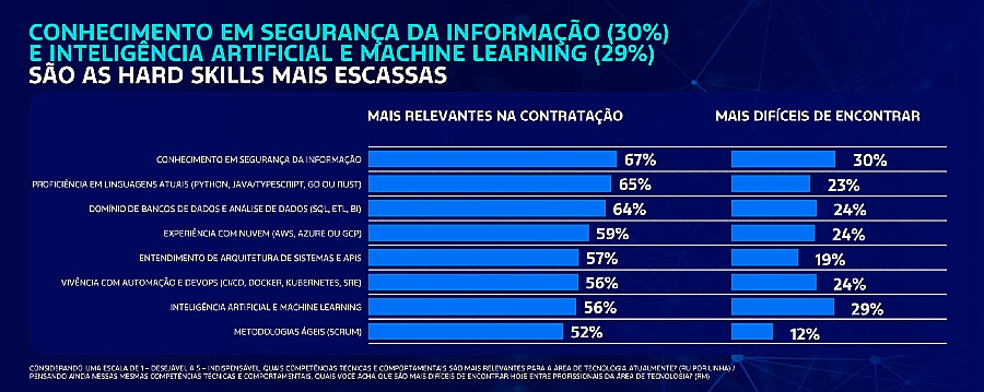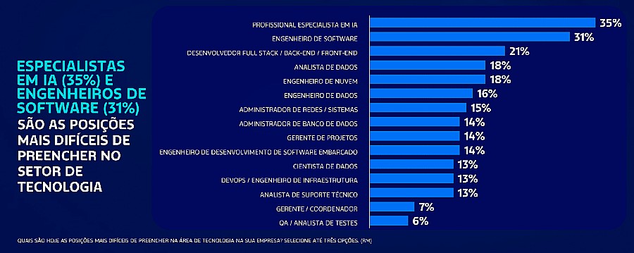 A pesquisa aponta que as posições mais difíceis de preencher são as de especialistas em Inteligência Artificial (35%), engenheiros de software (31%), desenvolvedores full stack / front-end / back-end (21%), analista de dados (18%) e engenheiro de nuvem (18%). As competências técnicas (hard skills) mais escassas no mercado são Segurança da Informação (30%), IA e Machine Learning (29%), Domínio de Bancos de Dados e Análise de Dados (24%), Experiência com Nuvem (24%) e Vivência com Automação e Devops (24%).