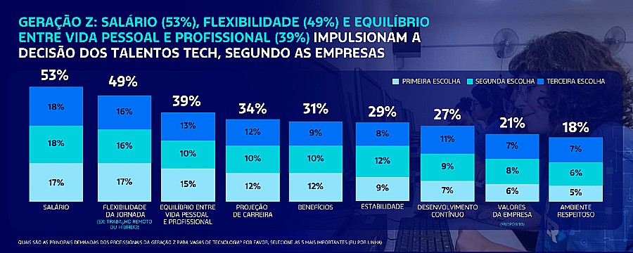 A pesquisa “Mercado de Trabalho Tech: Raio-X e Tendências” traz um recorte específico sobre a Geração Z, que merece atenção. Para os jovens profissionais “zoomers” ou “genzers” (como são chamados os que pertencem à Geração Z), os principais fatores na escolha de uma empresa são: