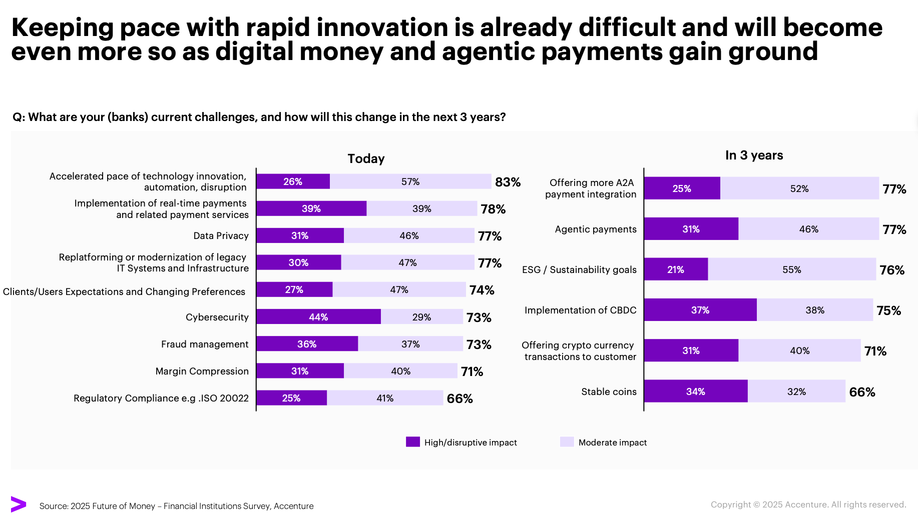 Esse descompasso se estende ao comércio internacional. Cresce o interesse corporativo por métodos alternativos de pagamento cross-border, incluindo carteiras digitais, provedores não bancários e moedas digitais como stablecoins, criptomoedas e CBDCs. Ainda assim, quase 8 em cada 10 bancos indicam que suportar esses métodos exigirá esforço substancial, envolvendo upgrades de middleware, APIs, automação de compliance e, em alguns casos, modernização profunda do core bancário.
