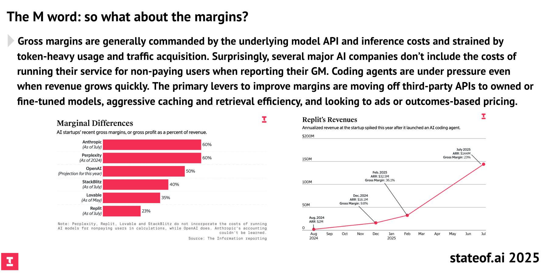 Mas há um custo oculto. O slide abaixo, um dos mais importantes do relatório, detalha a pressão sobre as margens brutas: “As margens brutas são cada vez mais ditadas pelos custos de inferência e pelos preços das API”, diz. Em outras palavras, a economia da IA é refém da computação.