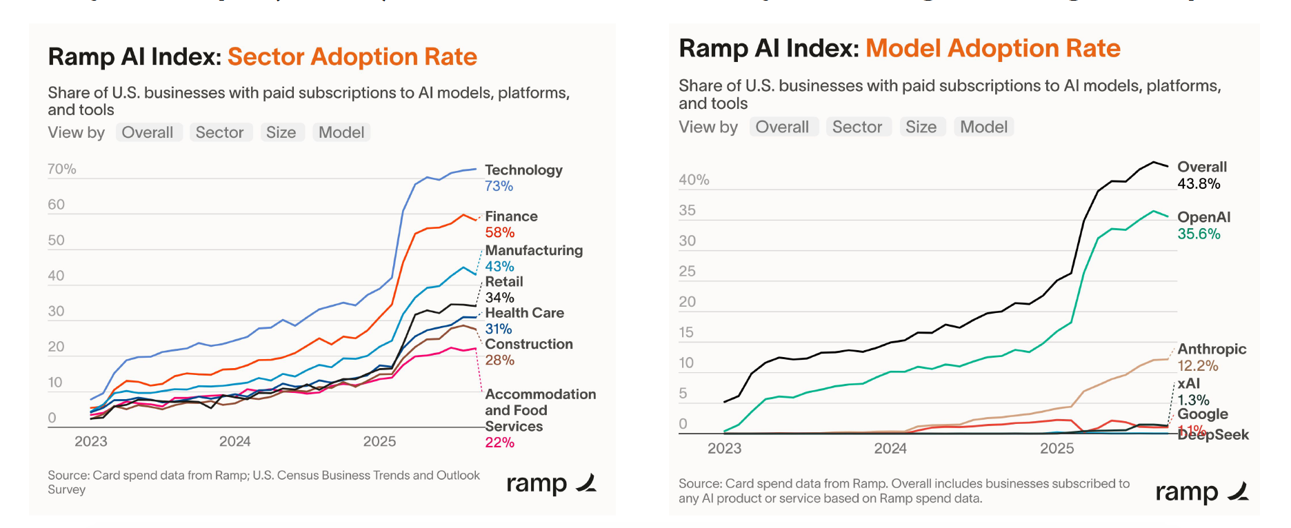 Mas a virada mais tangível do relatório está nos números de adoção corporativa. O State of AI 2025 mostra que 44% das empresas americanas já pagam por ferramentas de IA, contra apenas 5% em 2023. O contrato médio é de US$ 530 mil por ano. Startups AI-first crescem 1,5× mais rápido que seus pares SaaS tradicionais.