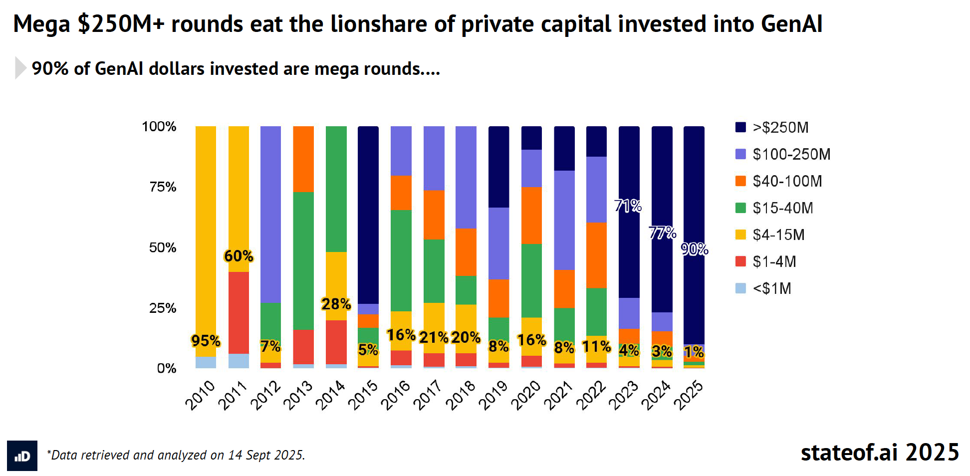 O gráfico de alocação de capital mostra o que ele chama de AI Megaround Syndrome: rodadas de mais de US$ 250 milhões respondem por 90% do funding em 2025. A bolha da IA, segundo o MarketWatch citado, já é “17 vezes maior que a bolha das dotcoms”.