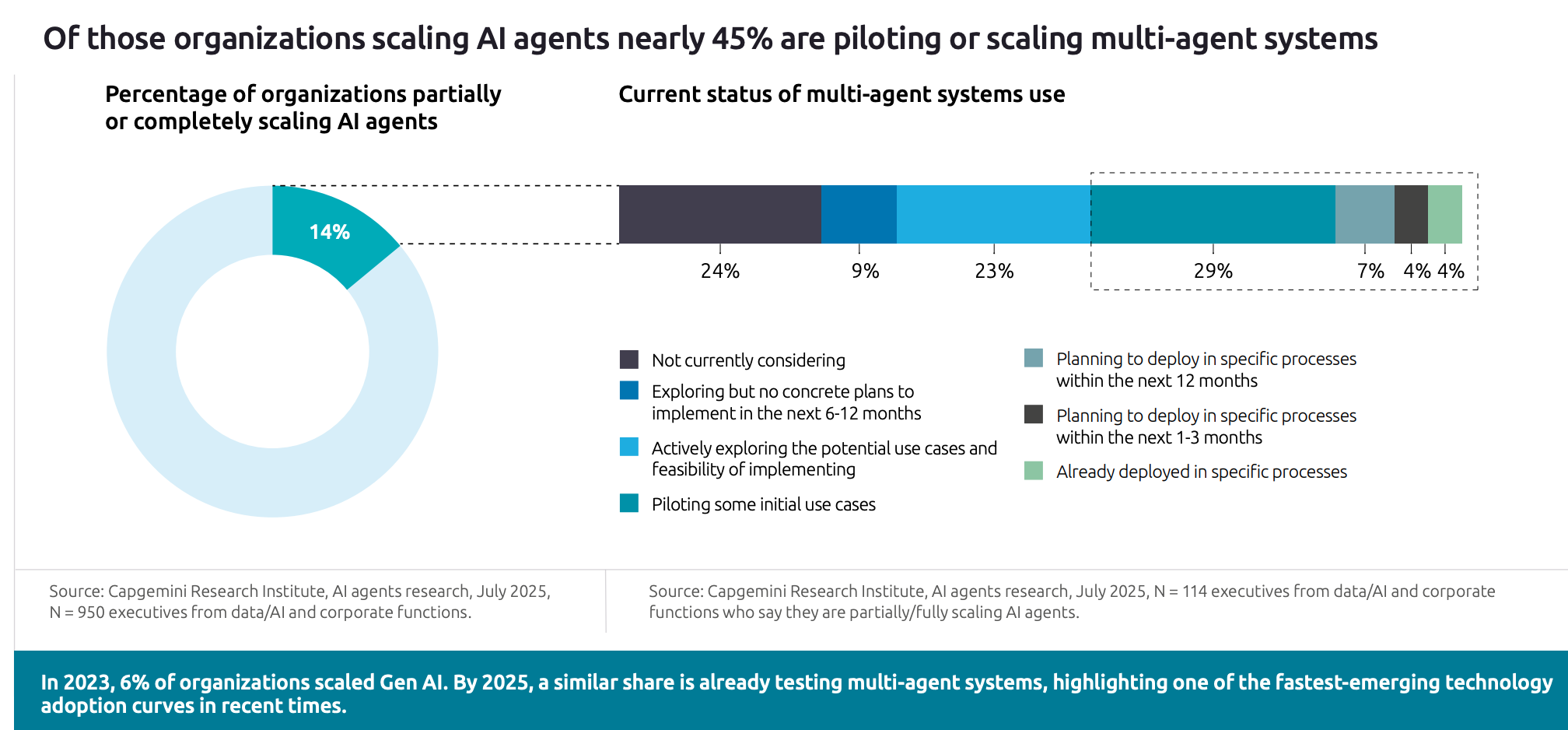 Segundo o Capgemini Research Institute, 29% das empresas já utilizam IA agentica em algum nível, e 44% planejam adotá-la no próximo ano. O movimento de experimentação deu lugar a pilotos robustos, que estão se transformando em plataformas operacionais em áreas como atendimento ao cliente, logística, detecção de fraudes e desenvolvimento de software. Em muitos casos, agentes já funcionam como operadores autodirigidos, impulsionados por dados em tempo real e aprendizado por reforço.