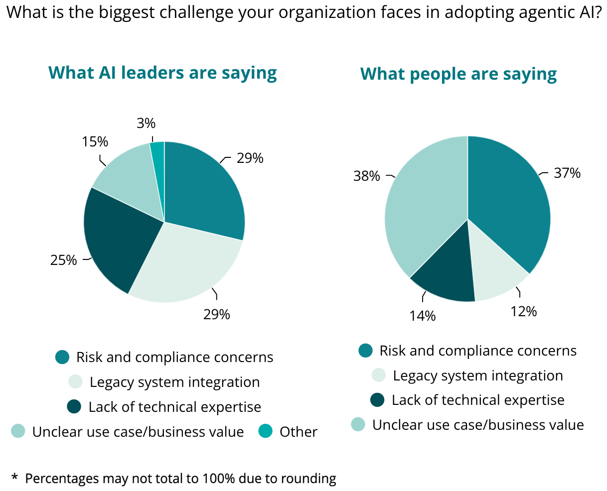 De acordo com Deloitte, 60% das lideranças de pesquisadas dizem que os principais desafios de suas organizações na adoção de IA Agêntica são a integração com sistemas legados e o enfrentamento de questões de risco e conformidade (gráfico abaixo). Essas principais barreiras foram seguidas de perto pela falta de conhecimento técnico. A transformação da força de trabalho em IA e a preparação de talentos estão se tornando um diferencial estratégico.