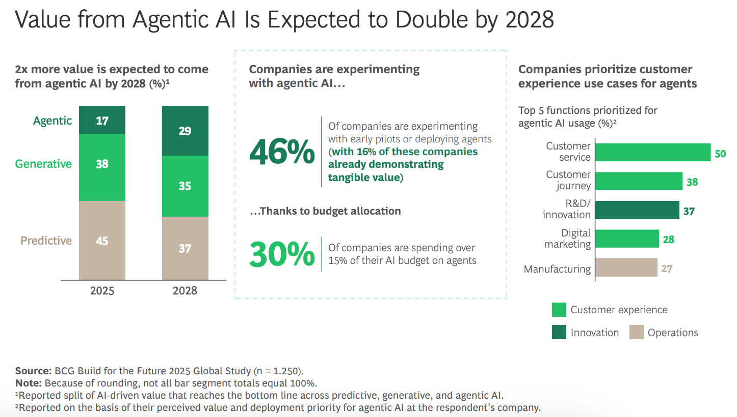 Segundo o BCG,os agentes de IA já representam cerca de 17% do valor total da IA em 2025 e espera-se que atinjam 29% até 2028. O estudo mostra que 46% das empresas estão experimentando ou colocando produção agentes de IA. Dessas, 16% já conseguem demonstrar valor tangível da tecnologia para os negócios. Isso se deve, segundo o BCG a investimento dirigido: 30% delas alocam 15% de seus orçamentos de IA para agentes.