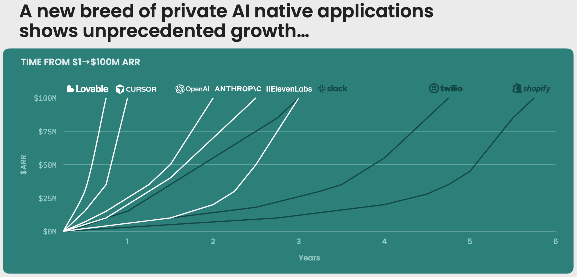 Se a camada de infraestrutura segue um caminho de concentração, a camada de aplicação apresenta dinâmica distinta. O relatório mostra que empresas nativas de IA, fundadas há dois ou três anos, avançam de US$ 1 milhão para US$ 100 milhões em ARR em poucos anos — o gráfico abaixo evidencia o salto entre o primeiro e o sexto ano de operação.