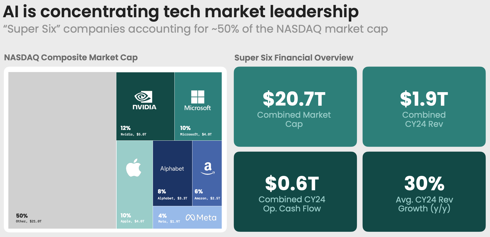 O fluxo de caixa operacional gerado anualmente pelas Super Seis (US$ 0,6 trilhão em 2024) continua a fortalecer seu domínio, já que estão entre as poucas empresas capazes de sustentar o nível de investimento necessário para manter a liderança em IA.
